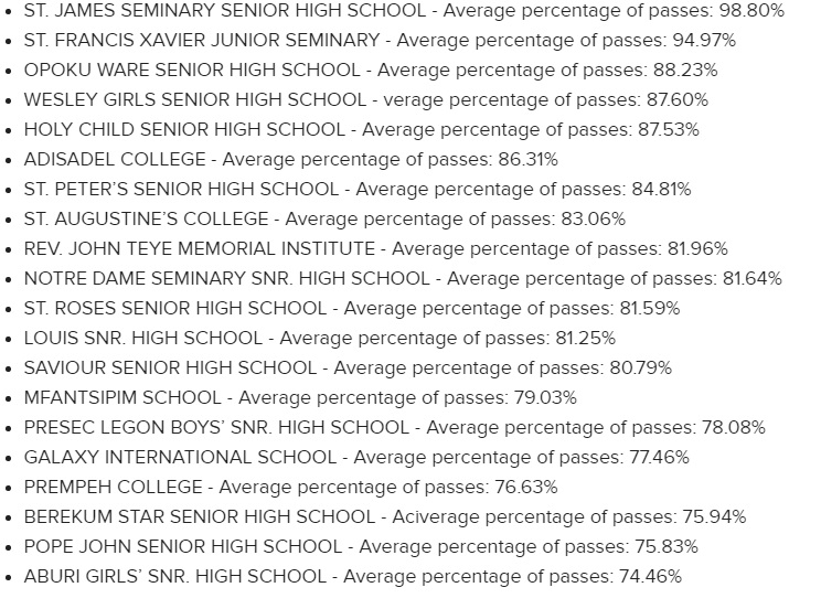 Wesley Girls Senior High School (87.60%) and Holy Child Senior High School (87.53%) purportedly also placed fourth and fifth respectively.