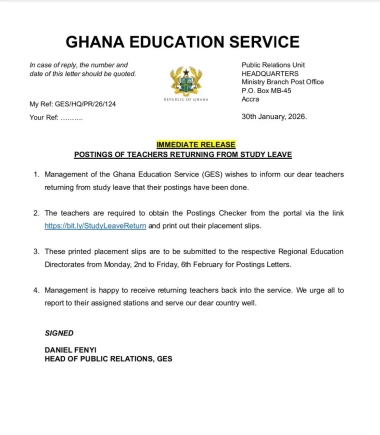 The Ghana Education Service (GES) has announced the completion of postings for teachers returning from study leave.