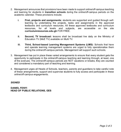 Management emphasised that online/off-campus periods are not vacations but mandatory teaching and learning sessions. Heads of schools, teachers, parents, and guardians are urged to support students in accessing these learning opportunities.