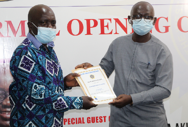 Prof. Kwasi Opoku-Amankwa (right), the Director-General of the Ghana Education Service, presenting a certificate to Mr Cecil Tetteh Kumah (left), 1st prize winner of the International Excellence Award for the WASSCE Candidates,2020. Picture: ESTHER ADJEI