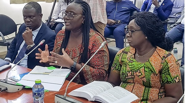 Prof. Rita Akosua Dickson, Vice-Chancellor, KNUST, answering questions at the Public Accounts Committee sitting in Accra. With her are Andrews Kwasi Boateng (left), Registrar, KNUST, and Gifty Twum Ampofo (right), a Deputy Minister of Education