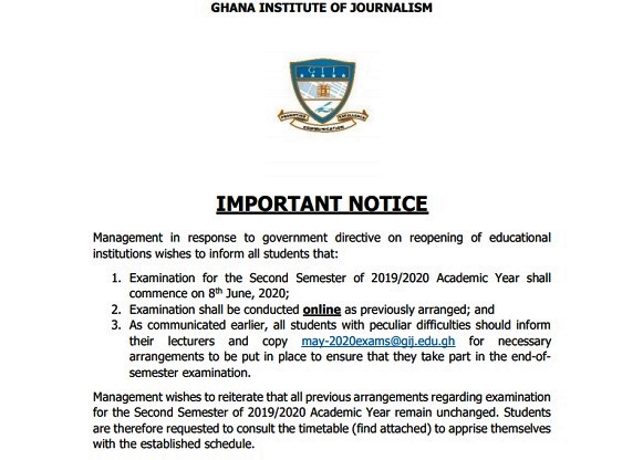The Ghana Institute of Journalism (GIJ) says its second semester examinations scheduled to commence on June 8, 2020 shall be conducted online as previously arranged.