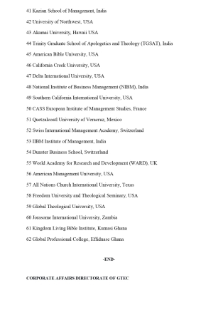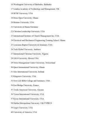 Among the 62 listed institutions, several are based in Ghana, including Debest College of Science, Arts and Business; Faith University Seminary (FUS) in Ghana; Doxa Open University; Electrical and Mechanical Engineering Training School; Quest International University; Kingdom Living Bible Institute in Kumasi; and Global Professional College in Effiduase.