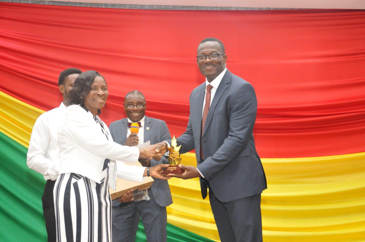 Mr Attafuah of Fidelity Bank presenting the Best Senior Member (Service and Innovation) to Dr Mrs Bam.
