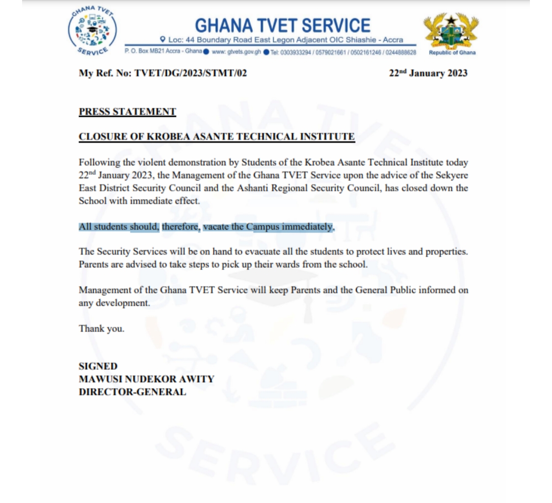 A press release issued by the Ghana TVET Service said all students had been directed to vacate the campus immediately.