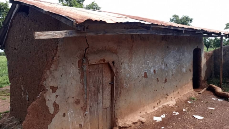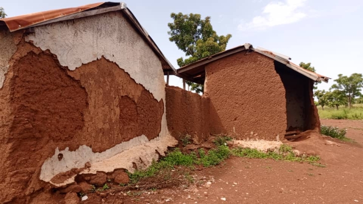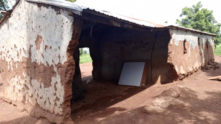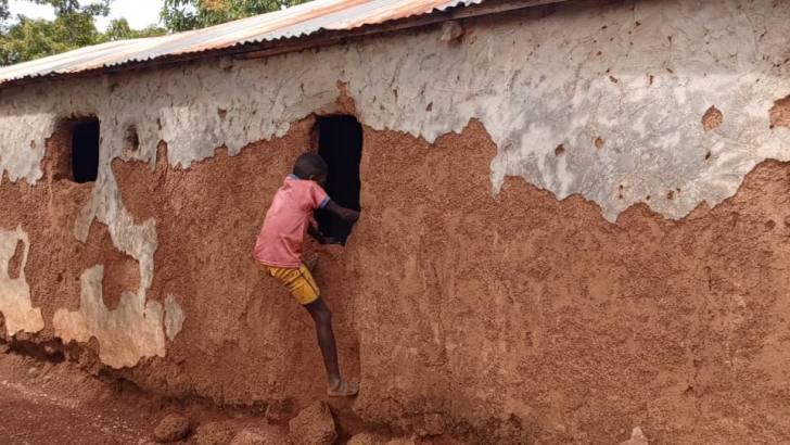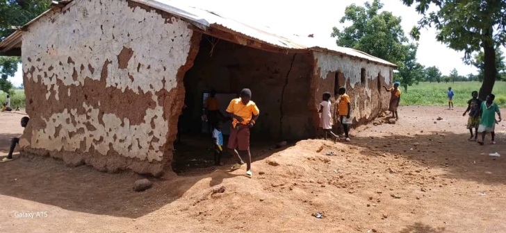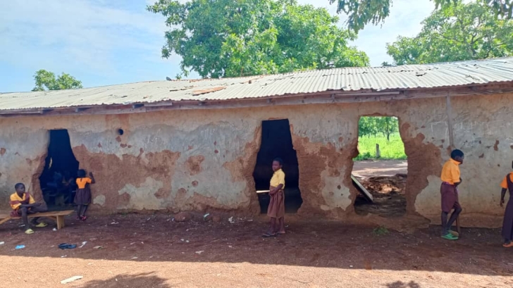 The mud-based building, with crumbling walls and rusted, dilapidated roofing, fails to provide a secure environment, making teaching and learning challenging, especially when it rains.