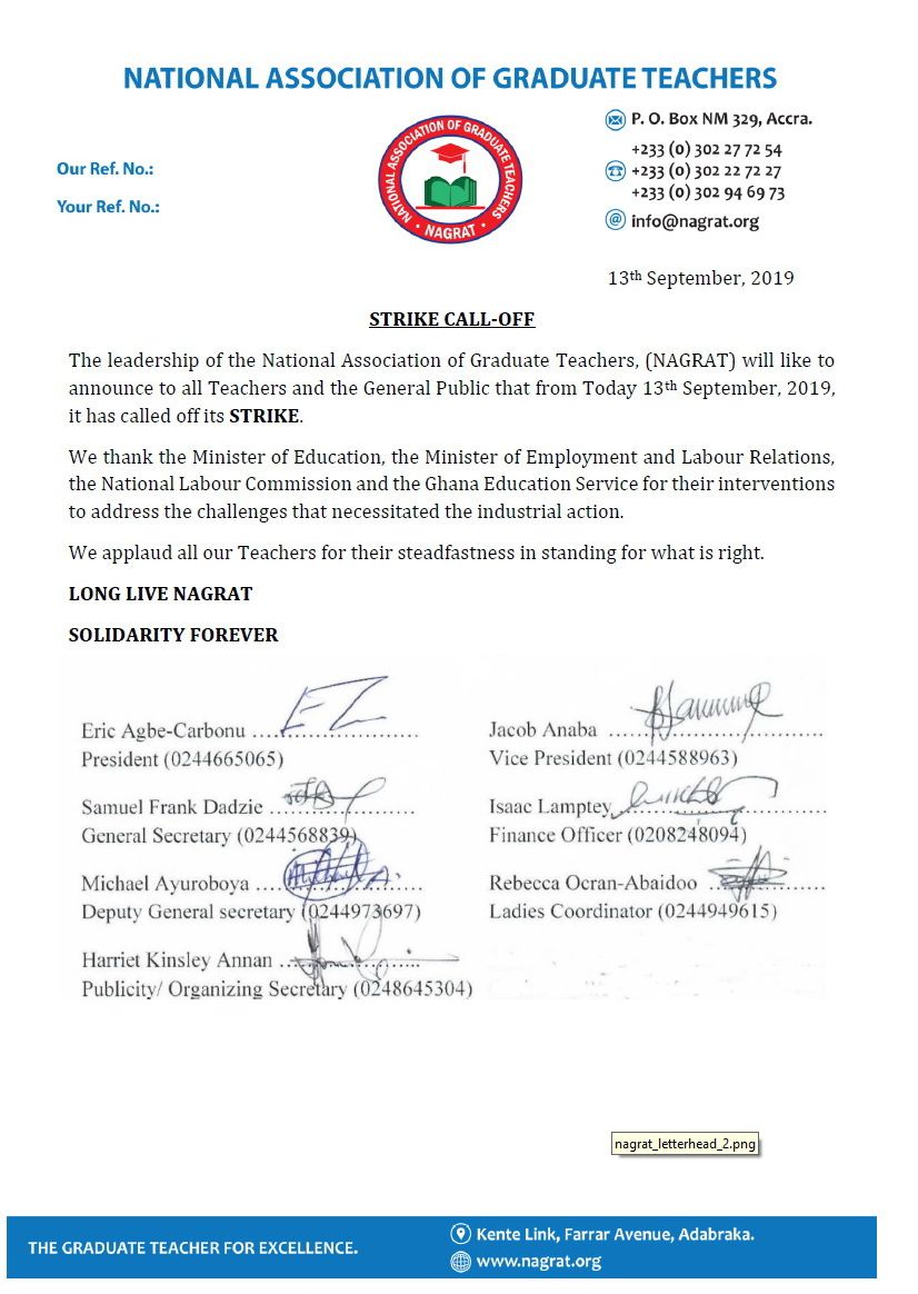 A statement issued by the association on Friday, September 13, 2019, said it called off the strike because of the interventions the Minister of Employment and Labour Relations, the National Labour Commission and the Ghana Education Service have made in addressing the challenges that necessitated the industrial action.