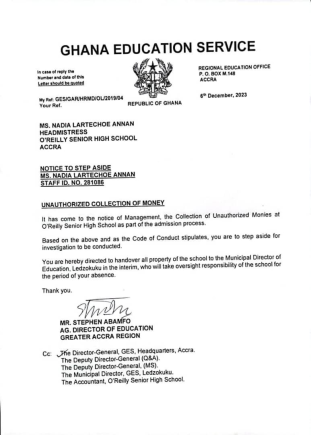 The letter, signed by Mr. Stephen Abamfo, Acting Director of Education for the Greater Accra Region, stated, "It has come to the notice of Management, the Collection of Unauthorized Monies at O'Reilly Senior High School as part of the admission process. Based on the above and as the Code of Conduct stipulates, you are to step aside for investigation to be conducted."