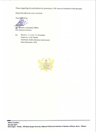 - Clarification as to whether his promotion to the rank of Professor occurred while he was a faculty member at the University of Education, Winneba, or during his secondment to GTEC; and