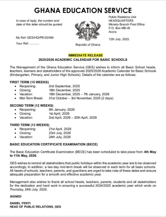 The Ghana Education Service (GES) has released the approved academic calendar for the 2025/2026 academic year, outlining key dates for Kindergarten, Primary, and Junior High Schools across the country.