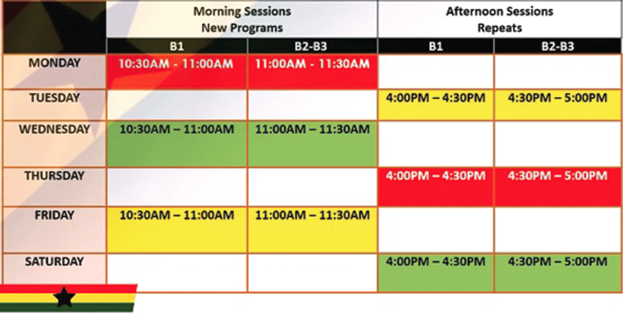 So far, all the 11 GES-approved Ghanaian language (Asante Twi, Akuapem Twi, Dagaare, Dagbani, Dangme, Ewe, Fante, Ga, Gonja, Kasem, Nzema) radio lessons now air mainly on Mondays and Wednesdays from 5 p.m. to 6 p.m.