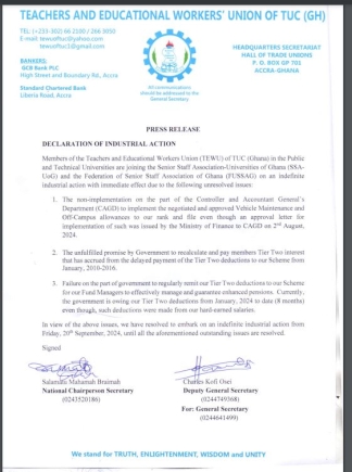 The Teachers and Educational Workers Union (TEWU) of the Trades Union Congress (TUC) has declared an indefinite nationwide strike, joining forces with the Senior Staff Association of Universities of Ghana (SSA-UoG) and the Federation of Senior Staff Association of Ghana (FUSSAG).