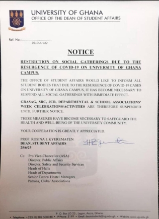 “Due to the resurgence of COVID-19 cases on the University of Ghana campus, it has become necessary to suspend all social gatherings with immediate effect,” the notice stated.