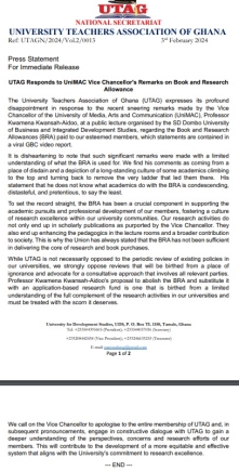 The University Teachers Association of Ghana (UTAG) has issued a stern response to Professor Kwamena Kwansah-Aidoo, Vice Chancellor of the University of Media, Arts, and Communication (UniMAC), following his recent comments on Book and Research Allowances (BRA).