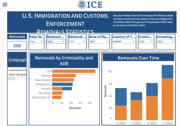 The U.S. Immigration and Customs Enforcement (ICE) deported a total of 258 Ghanaian nationals between 2021 and 2024, according to the agency's Enforcement and Removal Operations statistics.