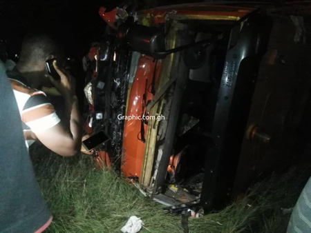 The eyewitnesses said the tipper truck caused the accident after it hit the Toyota Camry car with registration number GN 3741-11 and then collided head-on with a passenger mini bus heading from Michel Camp towards Afienya.