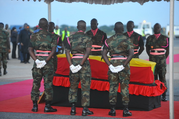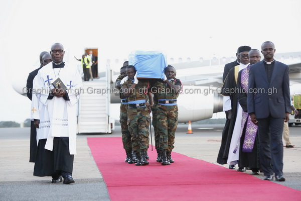 After the nearly one-hour ceremony, pallbearers carried the casket into a waiting hearse and the cortege of military artillery vehicles proceeded to the Accra International Conference Centre (AICC) where the body will lie in state from today to Wednesday for public viewing to be followed by burial service on Thursday.