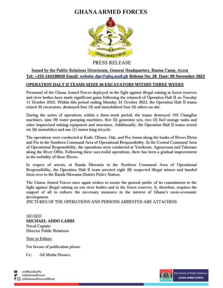 Personnel of the Ghana Armed Forces deployed in the fight against illegal mining in forest reserves and river bodies have made significant gains following the relaunch of Operation Halt II on Tuesday 11 October 2022. Within this period ending Monday 31 October 2022, the Operation Halt II teams seized 30 excavators, destroyed four (4) and immobilised four (4) others on site.