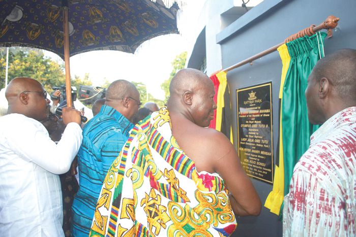Otumfuo unveiling a plaque to inaugurate Rattray Park in Kumasi