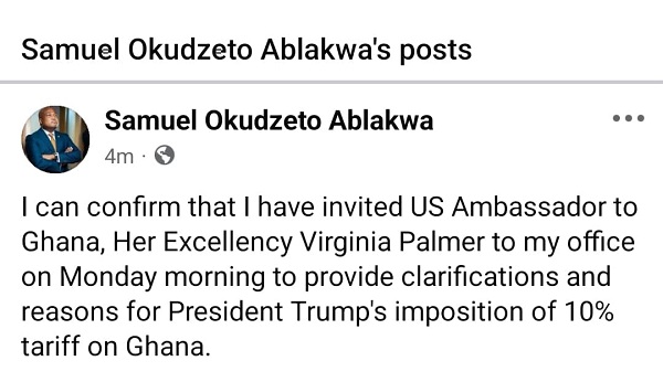 The Minister of Foreign Affairs, Samuel Okudzeto Ablakwa, has disclosed that he has formally invited the United States Ambassador to Ghana, Virginia Palmer, for clarifications following President Donald Trump’s imposition of a 10 per cent tariff on Ghanaian exports.