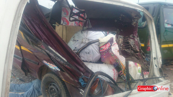 A police officer, Sergeant Eric Asare from the Airport Police station who was at the scene to control traffic told Graphic Online’s Isaac Yeboah that a female passenger on the front seat of the Hiace was thrown out through the windshield.