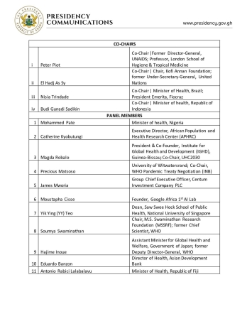 The 18-member panel, posted in a statement on Jubilee House’s Facebook page, will be co-chaired by four distinguished figures: Peter Piot, former director-general of UNAIDS; El Hadj As Sy, chair of the Kofi Annan Foundation; Nisia Trindade, Brazil’s Minister for Health; and Budi Gunadi Sadikin, Indonesia’s Minister for Health.