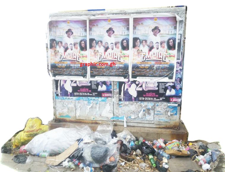 Electricity equipment have become a refuse dump and a notice board for advertisers.