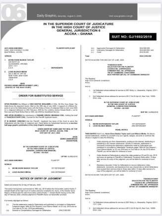 On Saturday, August 2, 2025, and following an Order for substituted service granted by the court, giving Mr Ankomah the leave to serve Kevin Taylor with the Entry of judgment and Penal Notice by Substituted Service by a one time-publication half page graphic publication in the Daily Graphic Newspaper, Mr Ankomah went ahead with the publication, that indicates that Kevin Taylor has been served with the judgment.