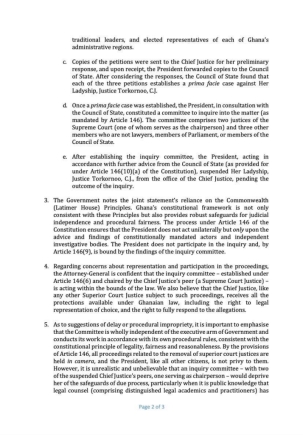 3. The Government notes the joint statement's reliance on the Commonwealth (Latimer House) Principles. Ghana's constitutional framework is not only consistent with these Principles but also provides robust safeguards for judicial independence and procedural fairness. The process under Article 146 of the Constitution ensures that the President does not act unilaterally but only upon the advice and findings of constitutionally mandated actors and independent investigative bodies. The President does not participate in the inquiry and, by Article 146(9), is bound by the findings of the inquiry committee.
