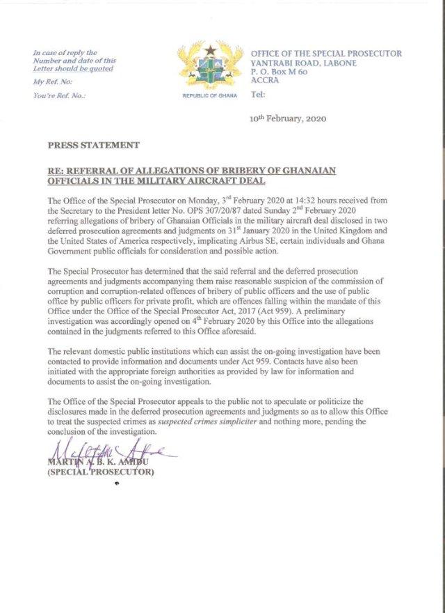 The Office of the Special Prosecutor on Monday, 3rd February 2020 at 14:32 hours received from the Secretary to the President letter No. OPS 307/20/87 dated Sunday 2nd February 2020 referring allegations of bribery of Ghanaian Officials in the military aircraft deal disclosed in two deferred prosecution agreements and judgments on 31s January 2020 in the United Kingdom and the United States of America respectively, implicating Airbus SE, certain individuals and Ghana Government public officials for consideration and possible action.