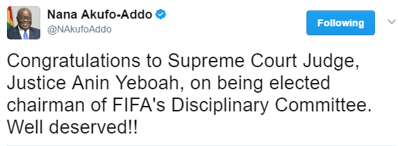 President Akufo-Addo has commended Supreme Court Judge, Justice Anin Yeboah on his election as the chairman of FIFA's Disciplinary Committee.