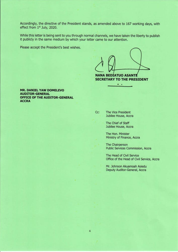 On the matter relating to the legality of the directive, the letter signed by the Secretary to the President, Nana Bediatuo Asante maintained that the Auditor-General has no knowledge in law and thus his perception of the directive being an affront to labour laws is “extremely misleading“.