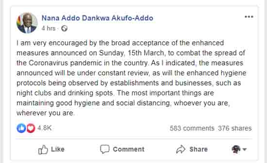 Early on, in a Facebook post on Monday morning, [March 16, 2020) President Akufo-Addo said he was "very encouraged by the broad acceptance of the enhanced measures announced on Sunday, 15th March, to combat the spread of the Coronavirus pandemic in the country."