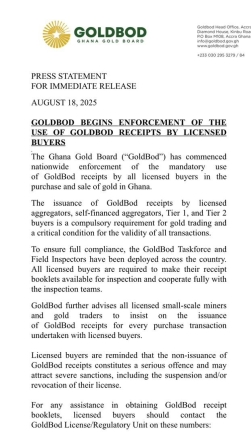 Effective Monday, August 18, 2025, all licensed gold buyers have been directed to issue official receipts from the Ghana GoldBod for every transaction.