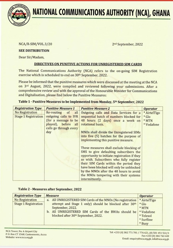This is part of punitive actions the National Communications Authority (NCA) has communicated to all Mobile Network Operators (MNO) for them to institute against users who have still not re-registered their SIM Cards beginning Monday, September 5, 2022.