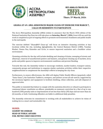 The Accra Metropolitan Assembly (AMA) has announced that the March 2026 edition of the National Sanitation Day Exercise will take place on Saturday, March 7, starting at 6:00 am.