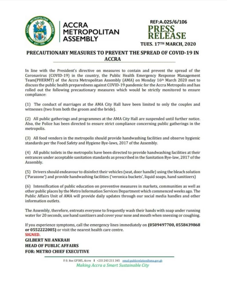 An AMA statement said the directive followed a meeting by the Public Health Emergency Response Management Team(PHERMT)of the AMA on Monday (March 16, 2020) which discussed the public health preparedness against COVID-19 pandemic for the Accra Metropolis.