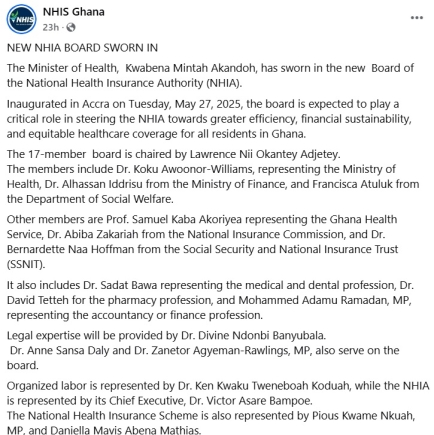 In a curious twist, however, the NHIA’s official Facebook page on Tuesday, May 27, 2025 — four days after the revocation letter — listed Anne Sansa Daly among a 17-member board sworn in by the Minister of Health, Kwabena Mintah Akandoh.