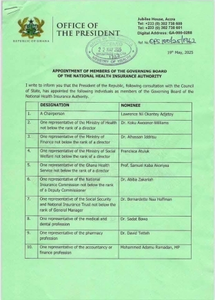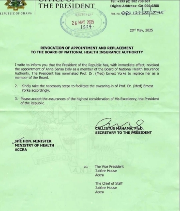 President John Dramani Mahama has revoked the appointment of Anne Sansa Daly from the Board of the National Health Insurance Authority (NHIA), in a move that has attracted significant public interest.