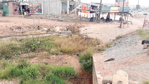 The main storm drain along the Awoshie Pokuase highway is filled with sand and weeds.