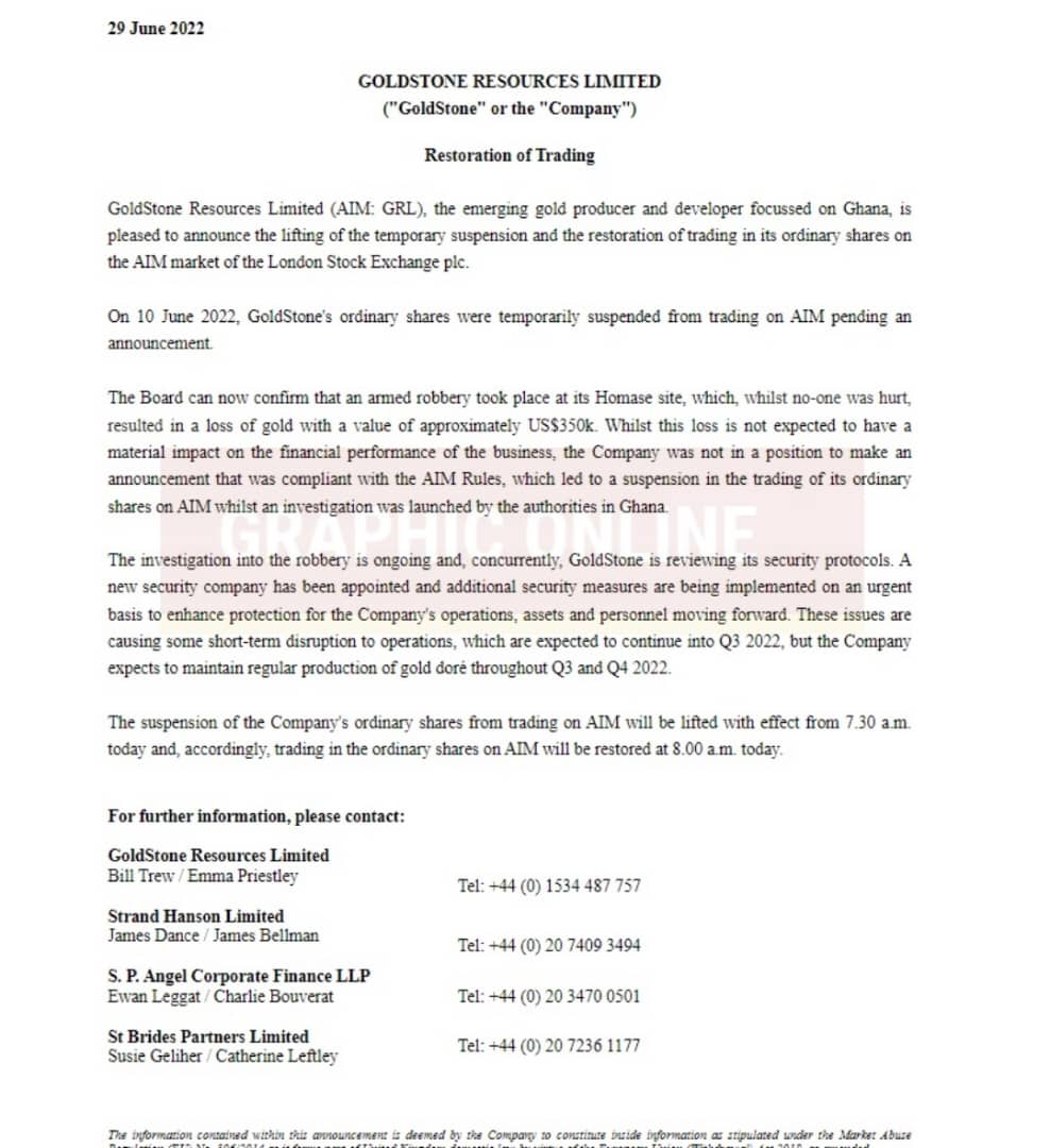 GoldStone Resources Limited (AIM: GRL), the emerging gold producer and developer focussed on Ghana, is pleased to announce the lifting of the temporary suspension and the restoration of trading in its ordinary shares on the AIM market of the London Stock Exchange plc.