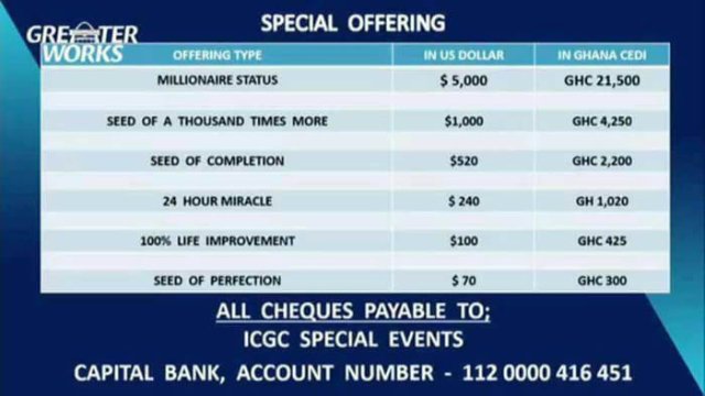 The ICGC recently held its annual "Greater Works" conference during which participants were urged to offer various sums of money for special prayers.