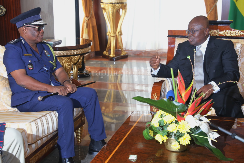President Akufo-Addo (right) interacting with Mr John Kudalor (left), the outgoing Inspector General of Police (IGP), at the Flagstaff House in Accra. Pictures: SAMUEL TEI ADANO