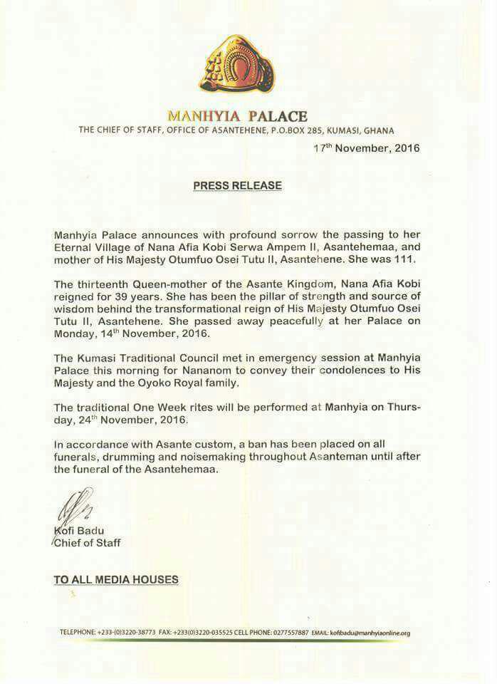 Below is a copy of a press statement issued and signed by Mr Kofi Badu, Chief of Staff at Manhyia Palace officially announcing the death of the queenmother.