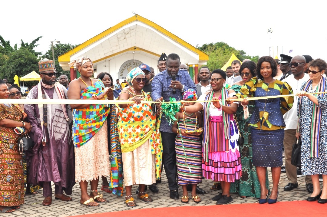 Pix: 1.Mrs Ashipala-Musayi (third right) being assisted by the Ho MCE and Mama Atrato (in glasses) to cut the tape to open the fair