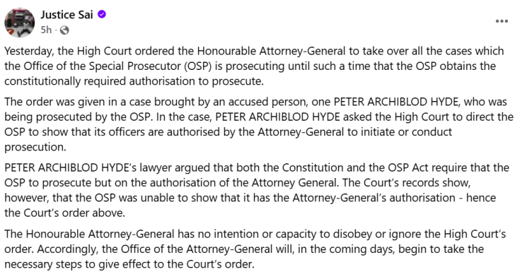The ruling stemmed from a legal challenge filed by an accused person, Peter Archiblod Hyde, who questioned the OSP’s authority to initiate and conduct prosecutions without prior authorisation from the Attorney-General. His legal team argued that both the Constitution and the Office of the Special Prosecutor Act require such authorisation before proceedings can lawfully commence.