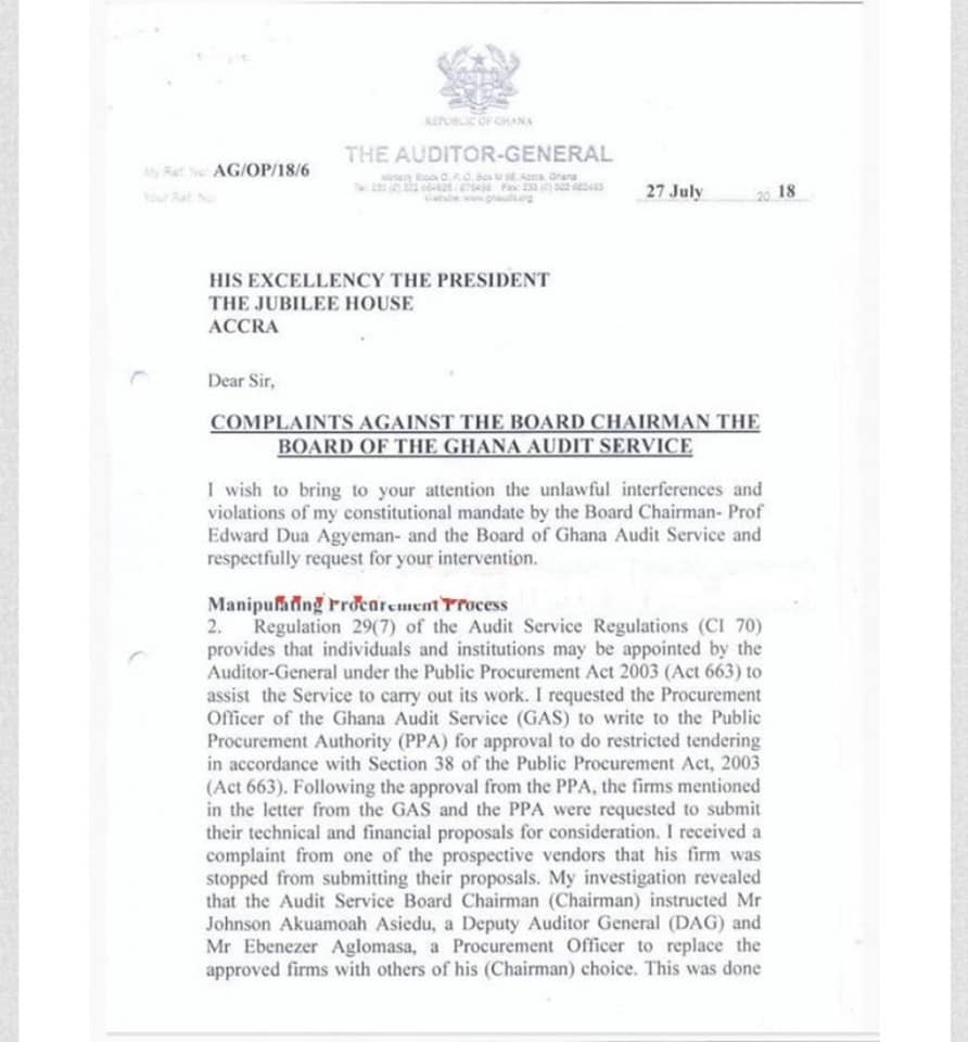 The Auditor-General, Daniel Yaw Domelevo, has sent a complaint to the Presidency over what he describes as interferences by the Board Chairman, Prof. Edward Dua Agyeman.