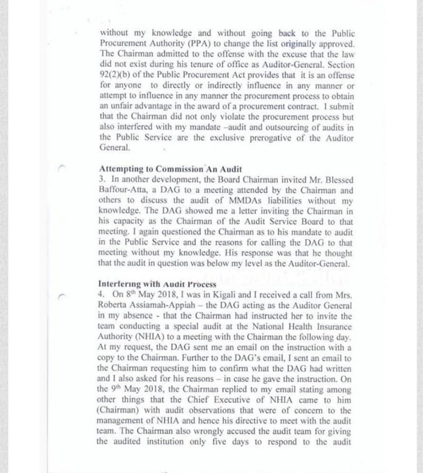 “This was done without my knowledge and without going back to the Public Procurement Authority (PPA) to change the list originally approved,” the letter stated and claimed that: “The Chairman admitted to the offense with the excuse that the law did not exist during his tenure of office as Auditor-General.