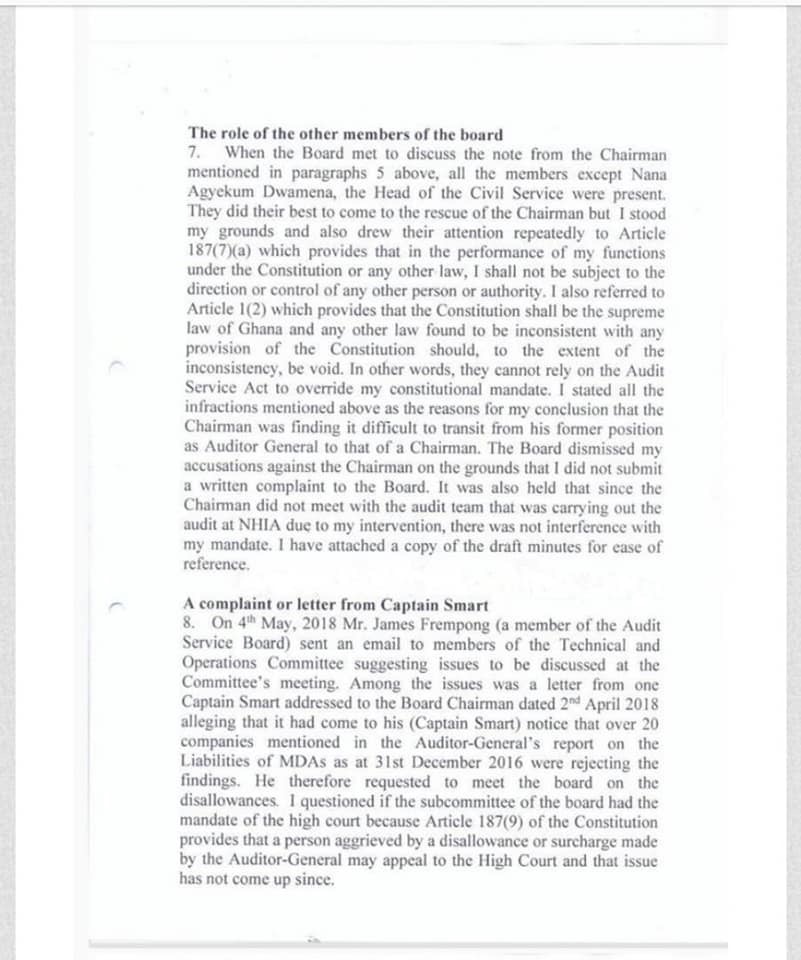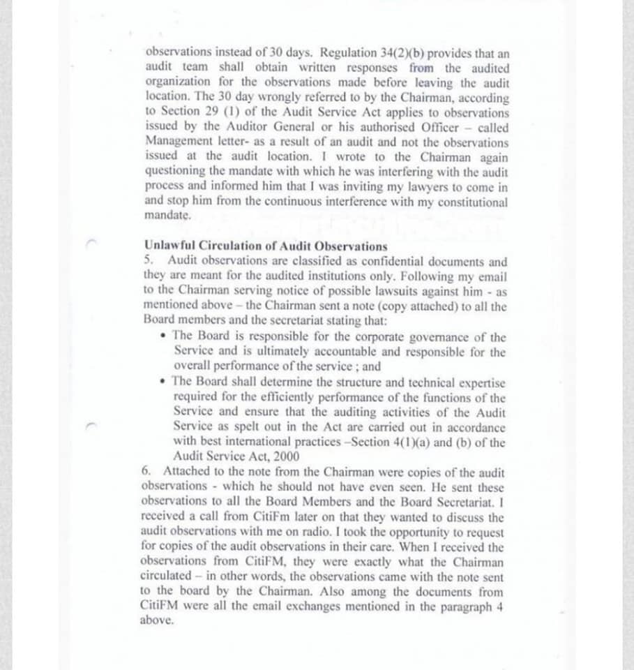 The Auditor-General also accused Prof. Dua Agyeman of holding a meeting with another Deputy Auditor-General, Blessed Baffuor-Atta and others, “to discuss the audit of MMDAs liabilities without my knowledge”. “The DAG showed me a letter inviting the Chairman in his capacity as the Chairman of the Audit Service Board to that meeting."