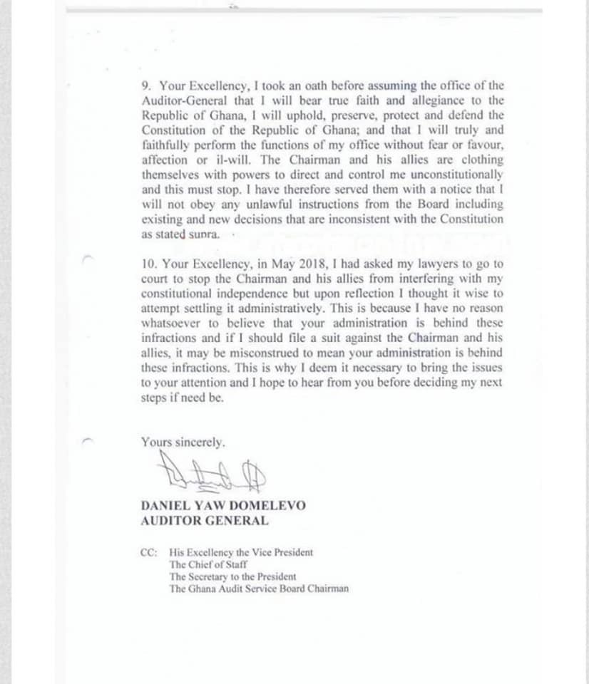 In a petition, dated July 27, 2018 and addressed to President Akufo-Addo, Mr Domelevo wrote: " I wish to bring to your attention the unlawful interferences and violations of my constitutional mandate by the Board Chairman - Prof Edward Dua Agyeman and the Board of Ghana Audit Service and respectfully request for your intervention."